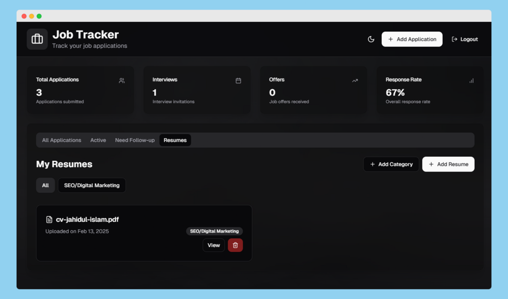 • Complete authentication system with email/password • Beautiful, responsive dashboard with application statistics • Application tracking with status updates (Applied, Interview, Offer, Rejected) • Resume management with category organization • Dark/light mode support • Mobile-optimized design • Country-based filtering and sorting • Follow-up reminder system