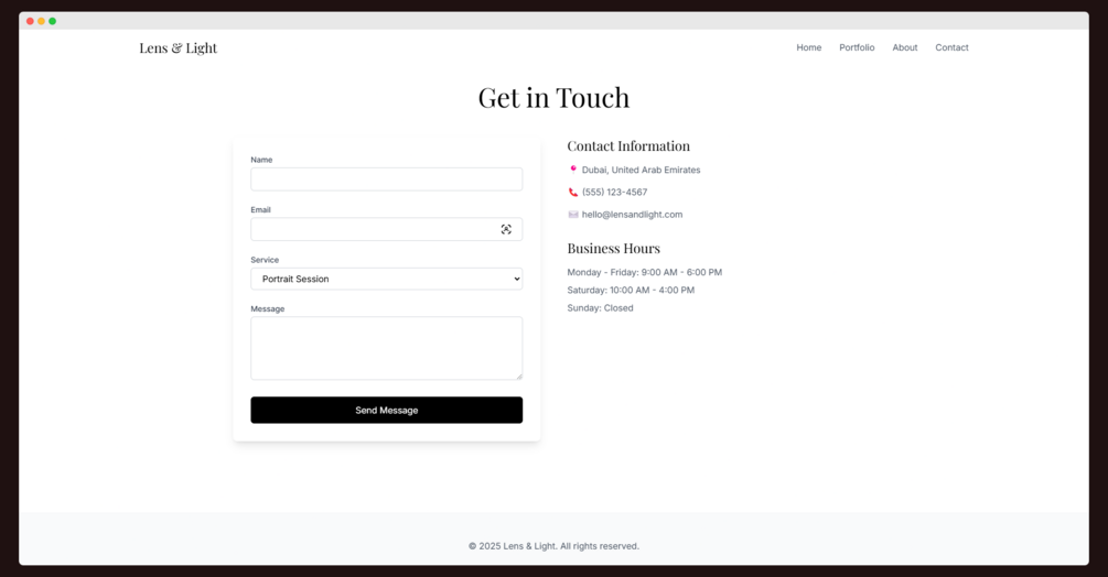 You'll get a modern photography portfolio website that beautifully showcases your work through an elegant design, interactive galleries, and a professional contact system - everything you need to attract clients and grow your photography business online.